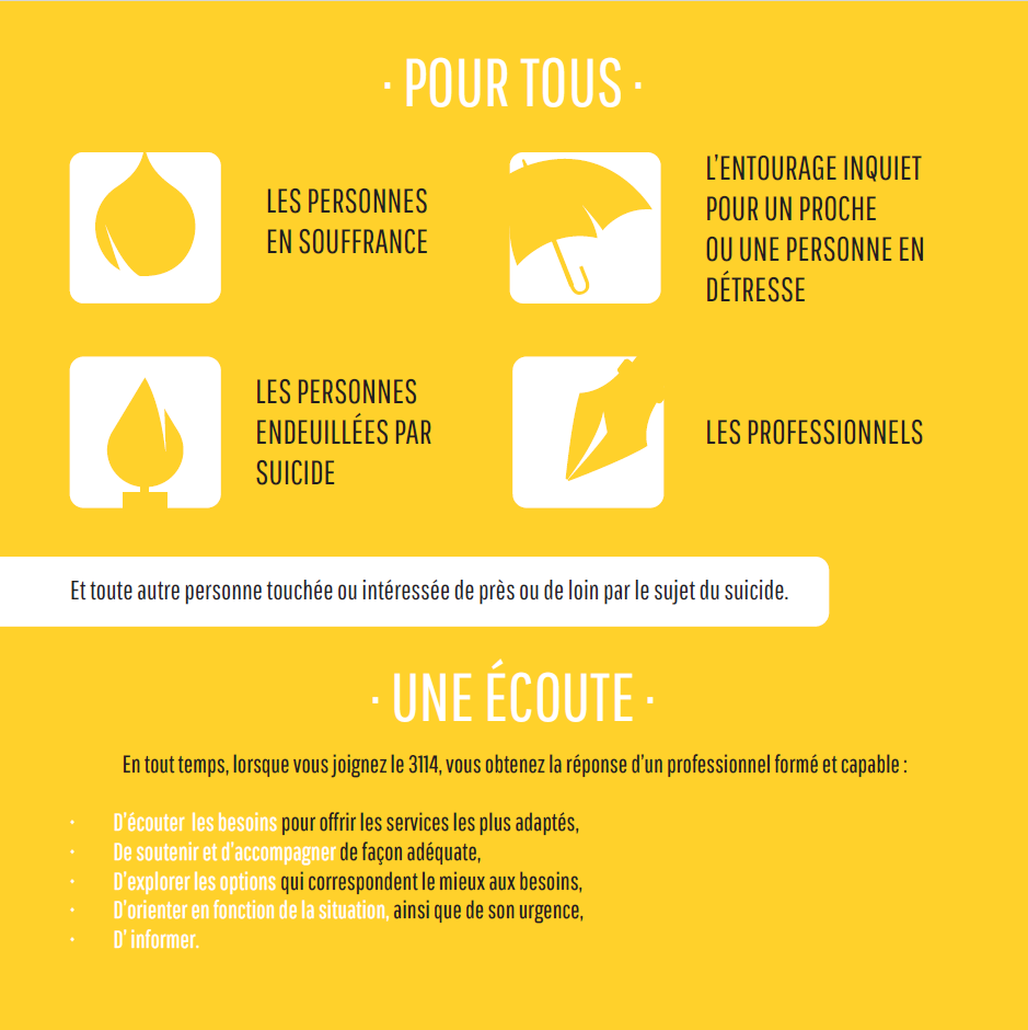3114, numéro national prévention suicideIl s’agit d’une ligne téléphonique proposant une réponse professionnelle et spécialisée en prévention du suicide et ce 24h/24h et 7j/7j à destination des personnes en souffrance, des proches et des professionnels.