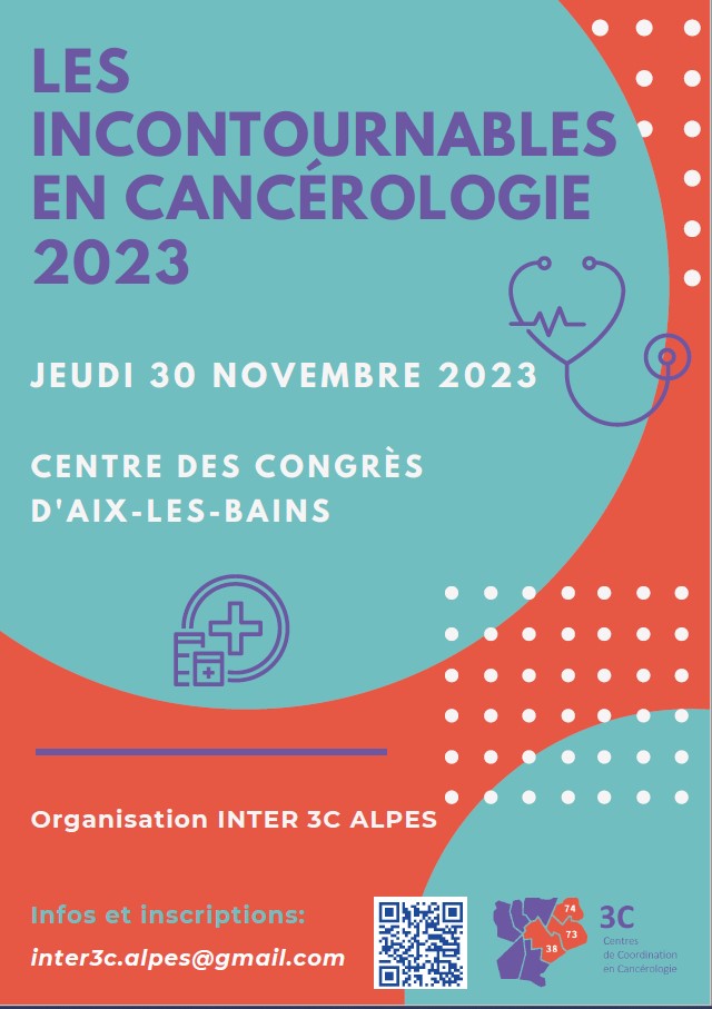 11ème édition du Congrès des Incontournables en Cancérologie qui se déroulera le jeudi 30 novembre 2023 à Aix-les-Bains. Accès préprogramme et informations pratiques via le site Internet du congrès : cliquez ici! Vous pouvez dès à présent vous inscrire : cliquez ici! Toute l'équipe de l'Inter 3C Alpes reste à votre disposition en cas de questions. |