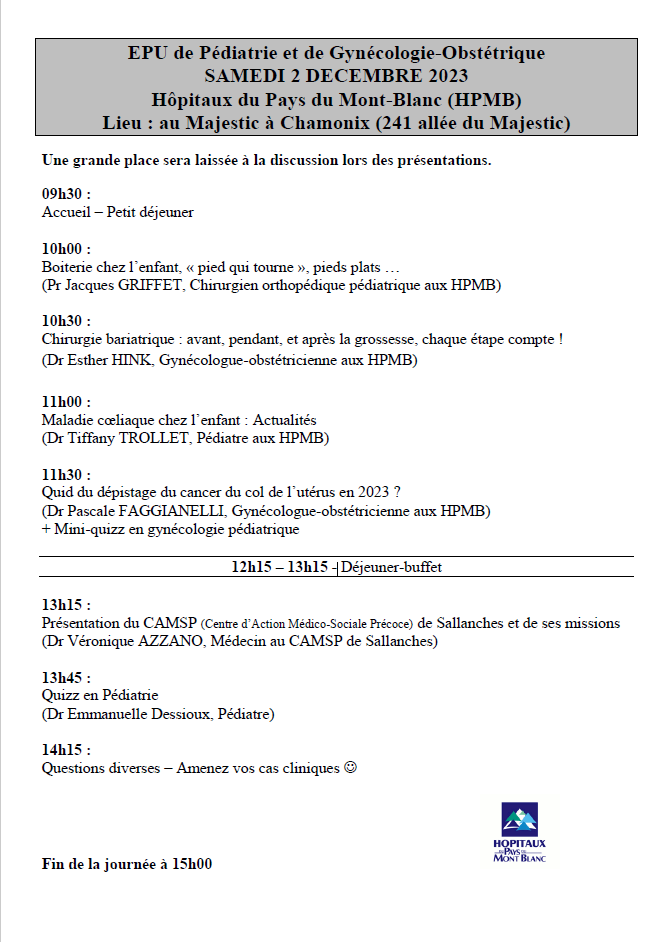 L’Enseignement Post-Universitaire de Pédiatrie – Gynécologie – Obstétrique des Hôpitaux du Pays du Mont-Blanc aura lieu le samedi 02 décembre 2023 au Majestic à Chamonix. Pour vous inscrire à cet évènement, nous vous invitons à remplir le formulaire en ligne, accessible ici. Clôture des inscriptions le 26 novembre 2023. |