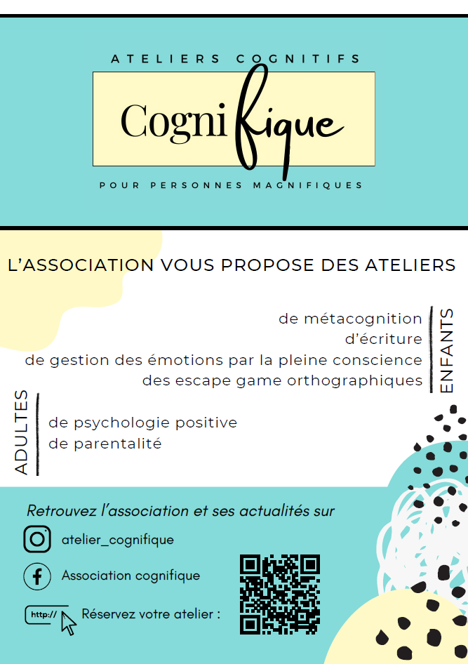 L’association Cognifique a pour but : - d’accompagner les enfants dans leurs apprentissages grâce à des propositions d’ateliers ludiques qui contribuent à leur développement - de proposer une démarche de partenariat parental qui permet de positionner le parent en tant qu’acteur et expert du développement de son enfant - de soutenir les équipes pédagogiques dans leur travail auprès des enfants présentant des troubles du neuro-développement L’ensemble du catalogue d’ateliers est proposé par des professionnel de santé. Les premiers ateliers auront lieu au mois de février avec un escape game orthographique pour les enfants en classe de CE1 jusqu'au CM2. Si vous souhaitez soutenir l’association et communiquer auprès de vos patients, l’association peut vous déposer des affiches pour vos cabinets. Retrouvez tout le calendrier des ateliers ainsi que les informations sur Instagram : atelier_cognifique Facebook : https://www.facebook.com/profile.php?id=61553519994037 |