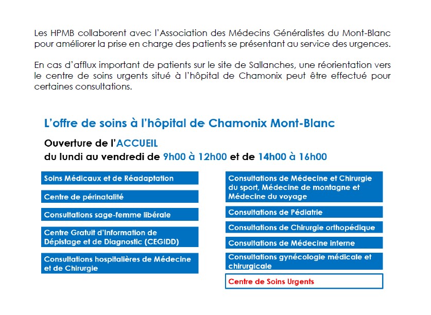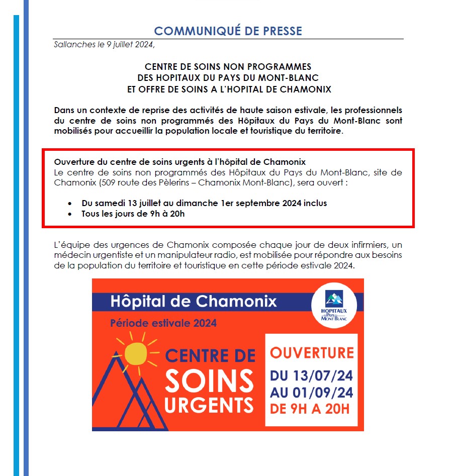 Dans un contexte de reprise des activités de haute saison estivale, les professionnels du centre de soins non programmés des Hôpitaux du Pays du Mont-Blanc sont mobilisés pour accueillir la population locale et touristique du territoire. Le centre de soins non programmés des Hôpitaux du Pays du Mont-Blanc, site de Chamonix (509 route des Pèlerins – Chamonix Mont-Blanc), sera ouvert :