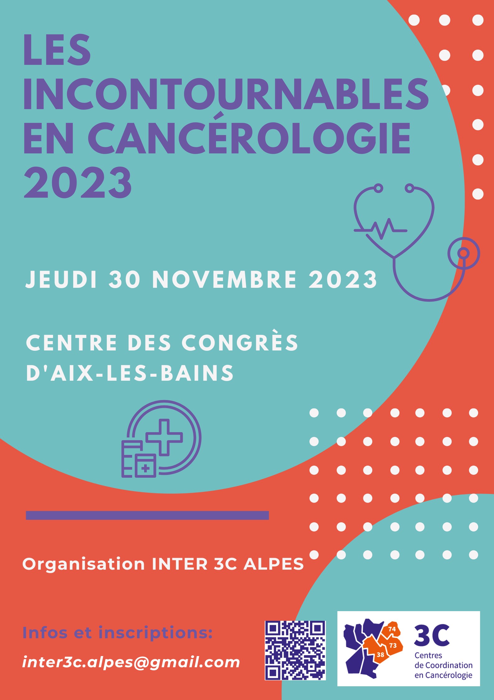 La prochaine édition du Congrès des Incontournables en Cancérologie aura lieu le jeudi 30 novembre 2023 à partir de 17h30 au Centre des Congrès d'Aix-Les-Bains. Bloquez bien cette date dans votre agenda ! Si vous souhaitez vous inscrire, voici le formulaire accessible en ligne : cliquez ici! Découvrez le préprogramme disponible sur le site internet du congrès = Accueil | Incontournables 3C Toute l'équipe de l'INTER 3C Alpes vous donne rendez-vous prochainement pour la diffusion du programme finalisé ! |